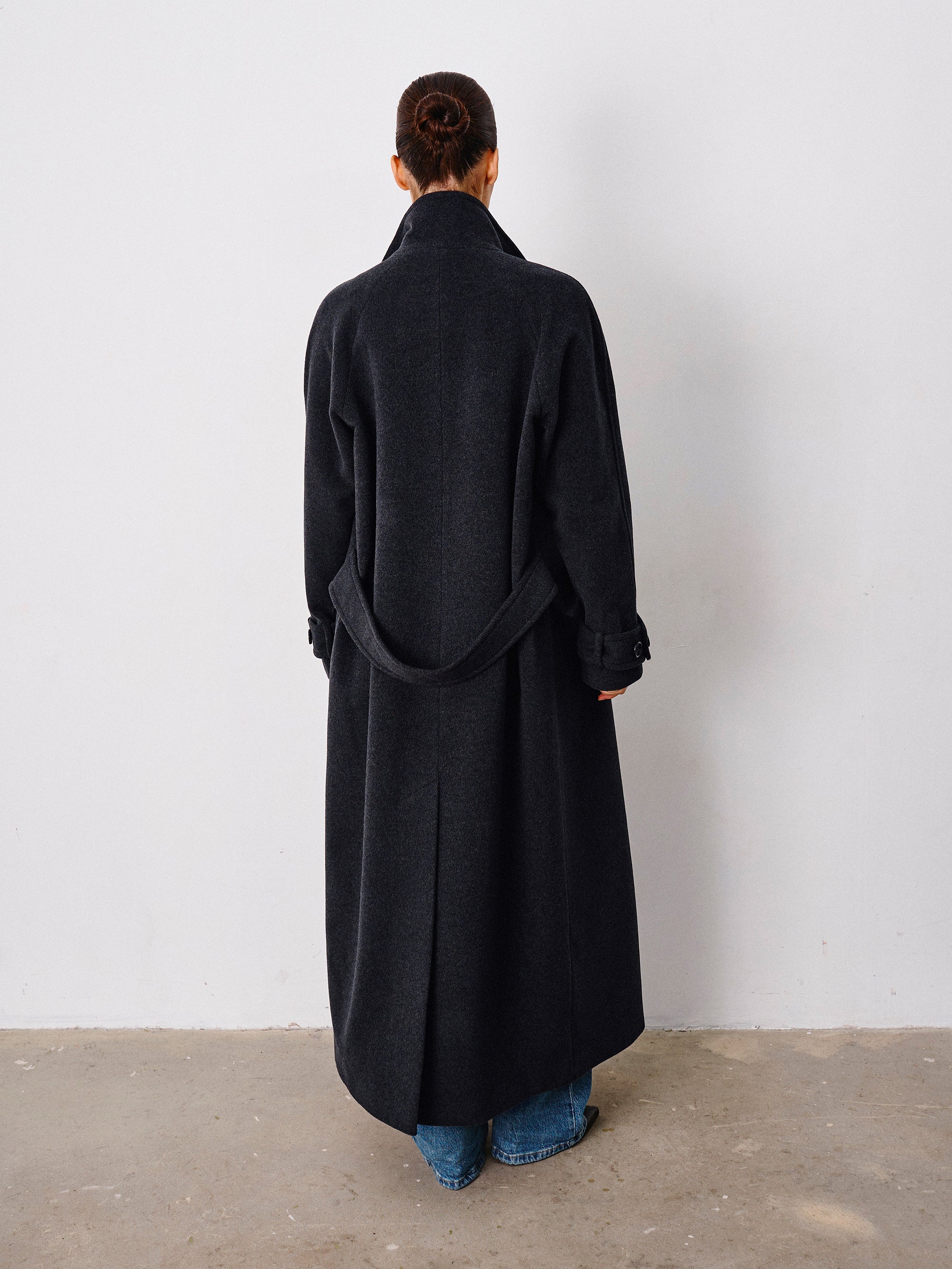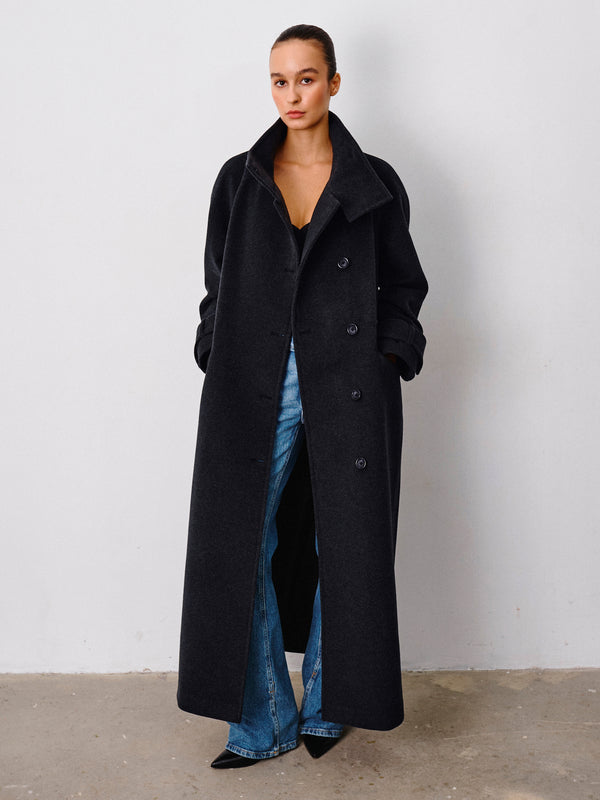 Graphite Wool Coat with Stand Collar – Wabi-Sabi Elegance | CHELIE