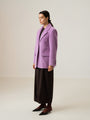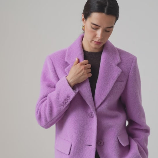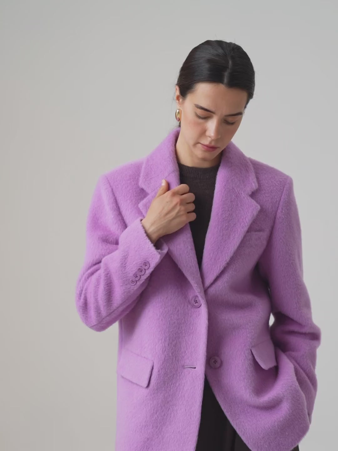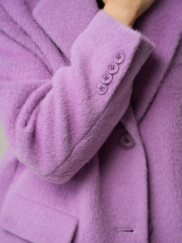 Create from 70% mohair, 20% wool, and 10% polyamide, this purple fluffy jacket is warm and lightweight. The soft viscose lining ensures comfort, while the oversized cut allows layering over sweaters or hoodies. Designed in a masculine-inspired silhouette, this purple wool jacket for women is perfect for versatile styling. Recommended for temperatures no lower than 0°C (32°F).